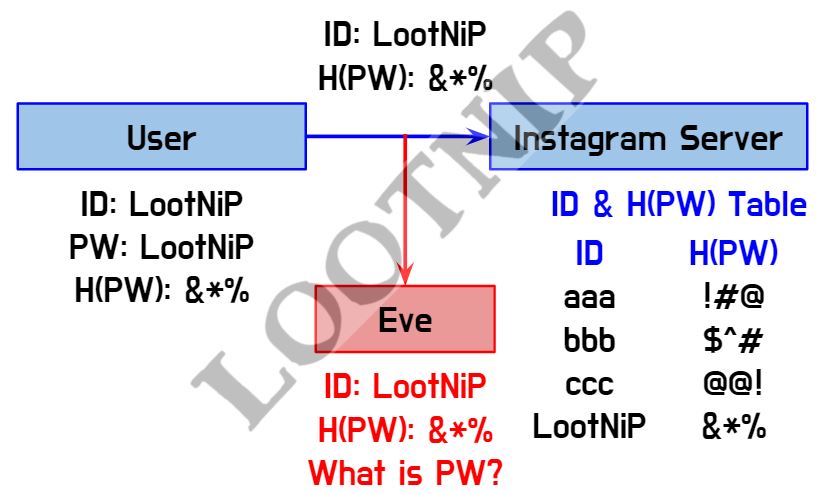 즉, “유저(User)”가 “인스타그램 서버(Instagram Server)”에 패스워드를 보낼 때 평문 형태(LootNiP)가 아닌 패스워드의 해쉬값(&*%)을 전송하는 것이다.